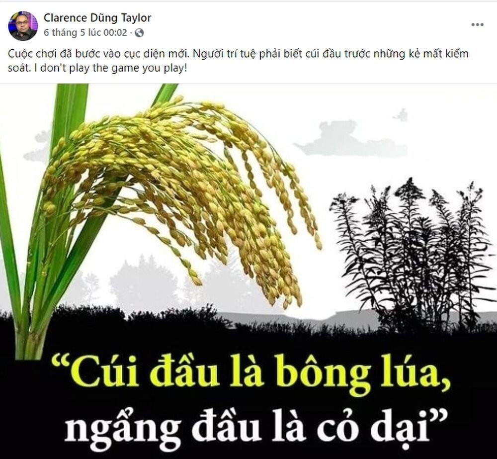 Tuy nhiên, điều khiến khán giả thắc mắc nhất chính là trước đó một ngày, Dũng Taylor cũng có một bài đăng sâu cay khi đưa ra hình ảnh khác để nói về việc ngẩng cao đầu hay cúi đầu trước biến cố. Cụ thể, anh viết: "Cuộc chơi đã bước vào cục diện mới. Người trí tuệ phải biết cúi đầu trước những kẻ mất kiểm soát. I don't play the game you play!", cùng với đó là hình ảnh bông lúa nặng trĩu đang cúi đầu chờ đến ngày gặt và so sánh với đám cỏ dại đang ngẩng cao đầu