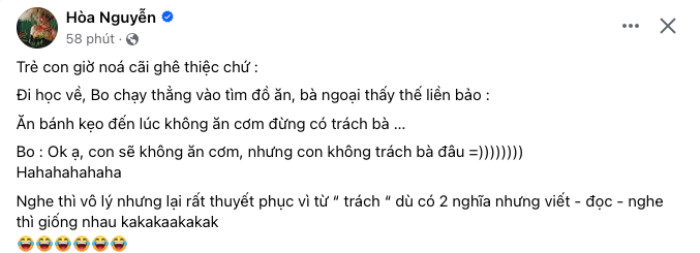 Tối 24/4, Hoà Minzy đăng tải dòng trạng thái về cuộc đối thoại giữa mình với bé Bo khi đang đi trung tâm thương mại mua sắm. Cô viết: "Bo với mẹ đi siêu thị. Đang đi qua mấy cửa hàng đồ màu hồng thì thấy mẹ ngó ngó, Bo quan sát rồi kéo tay mẹ lại: "Mẹ thích thì mua thôi". Mẹ lắc đầu đi tiếp, qua cửa hàng chụp ảnh kiểu Hàn thì họ bày cả đống đồ, vương miện công chúa các thứ, mẹ chạy vào hào hứng mua thì hoá ra họ không bán. Mẹ vừa đi vừa mếu khóc khóc. Bo quan sát thấy lại kéo tay mẹ, kiểu rất ga lăng luôn và bảo: "Mẹ thích thì mua thôi". Khi 2 mẹ con cùng quay lại hỏi, cô nhân viên nói không bán, cũng không cười gì cả mặt khá nghiêm. Bo lặng lẽ quay đi, không nắm tay mẹ nữa. Bo đi trước, tay phải vỗ bụp cái vào trán, lẩm bẩm: "Thật xấu hổ". Ủa sao xấu hổ?".