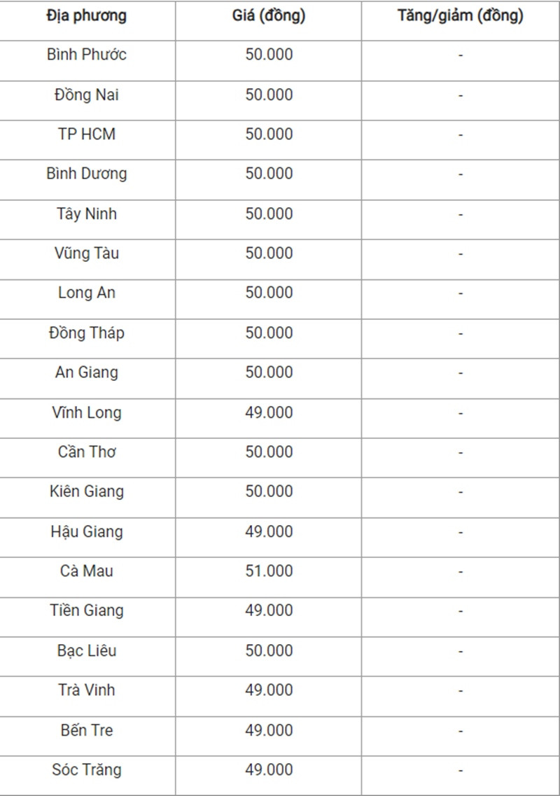 Ở chiều ngược lại, mức giá thấp nhất khu vực 49.000 đồng/kg được ghi nhận tại Vĩnh Long, Hậu Giang, Tiền Giang Trà Vinh, Bến Tre, Sóc Trăng.