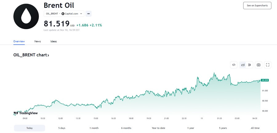Ghi nhận vào lúc 8h30 ngày 11/11 (giờ Việt Nam), Dầu Brent tăng 1,686 USD/thùng, tương ứng +2,11% ở mức 81.519 USD/thùng. Giá dầu WTI tăng 1,58 USD/thùng, tương ứng +2,09% ở mức 77.12 USD/thùng.