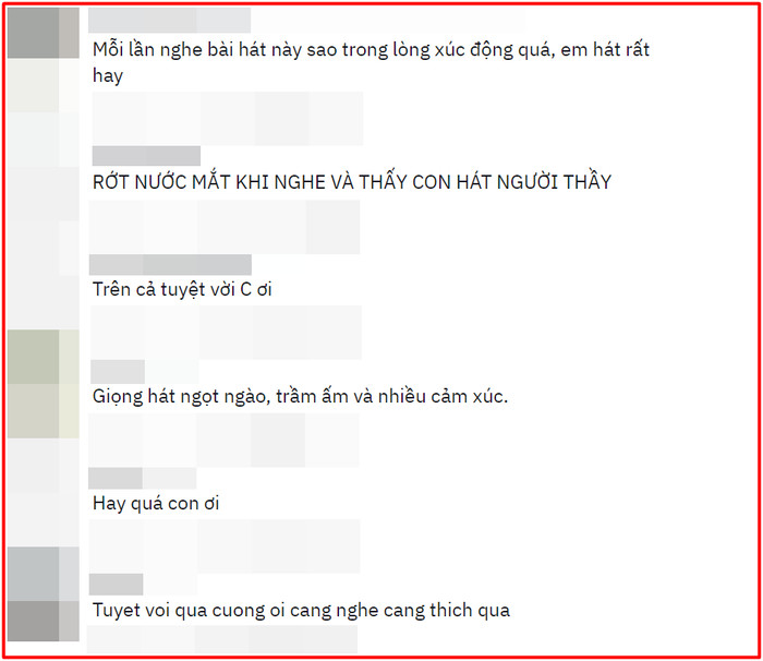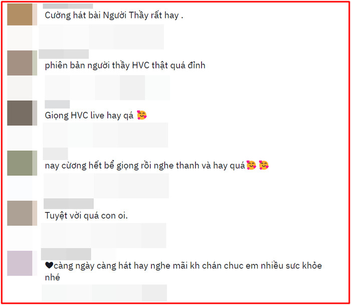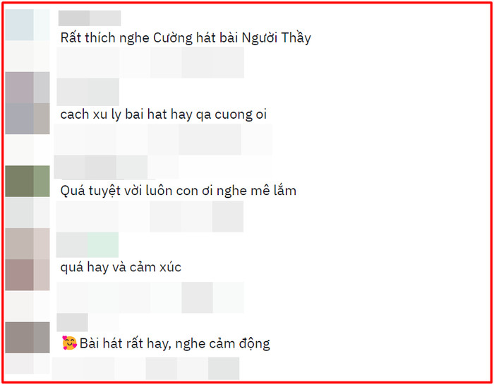 Bên dưới đoạn clip, đông đảo cư dân mạng đã cho rằng giọng hát của Hồ Văn Cường ngày một thăng hạng theo thời gian. Từng bị bể giọng trong thời điểm dậy thì, với quyết tâm nỗ lực trau dồi không ngừng nghỉ, Hồ Văn Cường giờ đây đã khiến người hâm mộ vô cùng an tâm vì giọng hát ngày một chín mùi, cảm xúc. Ngoài ra, một số cư dân mạng đã thừa nhận rằng họ đã rất cảm động, thậm chí rơi nước mắt khi nghe Hồ Văn Cường hát ca khúc Người Thầy trên sân khấu trường học.