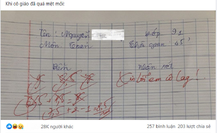 Có lẽ, cô giáo cũng cảm nhận được màn chấm điểm của mình khá "cồng kềnh", do đó, ở phần nhận xét, cô giáo đã gửi lời xin lỗi đến học sinh và đưa ra lý do khiến tất cả cười ngất: "Cô bị lag".