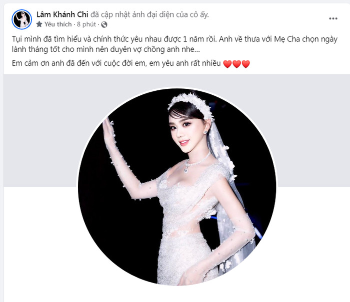 Ngày 1/4, Lâm Khánh Chi gây bất ngờ khi đăng tải hình ảnh diện váy cưới. Không những vậy, người đẹp chuyển giới còn đính kèm dòng trạng thái: "Tụi mình đã tìm hiểu và chính thức yêu nhau được 1 năm. Anh về thưa mẹ cha chọn ngày lành tháng tốt cho mình nên duyên vợ chồng nha. Em cảm ơn anh đến với cuộc đời em, em yêu anh rất nhiều".
