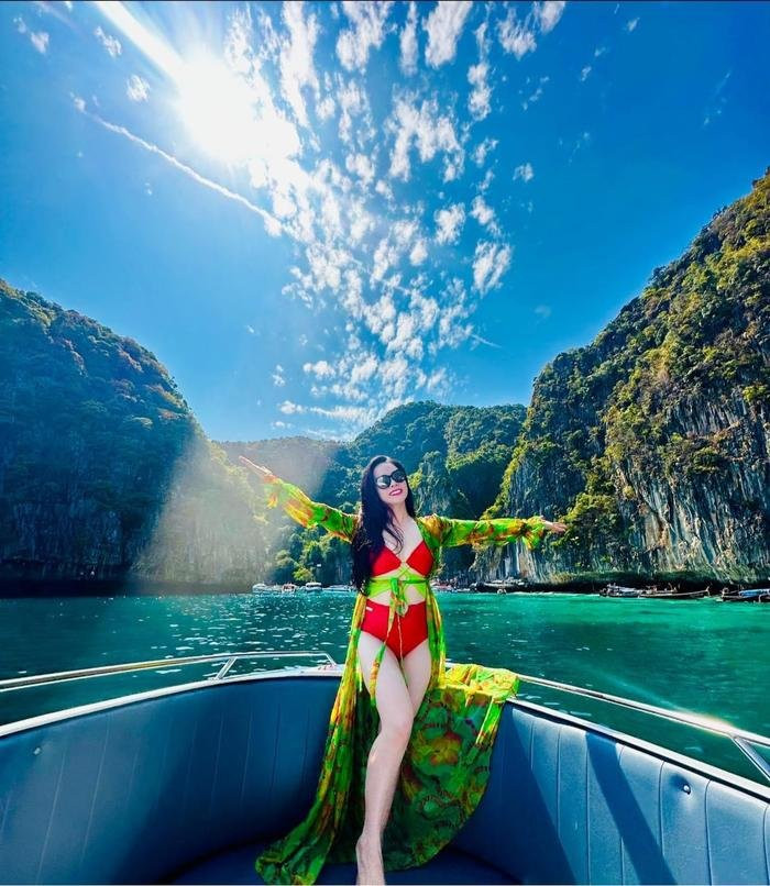 Mới đây, trên trang cá nhân Nhật Kim Anh xả kho loạt ảnh diện bikini với visual “vạn người mê”. Nữ diễn viên chọn style bikini với tông màu đỏ rực làm điểm nhấn. Bên ngoài, người đẹp mix chiếc áo choàng mỏng nhiều sắc màu. Nhật Kim Anh ngồi trên chiếc du thuyền đầy sang chảnh, thần thái lạnh lùng khiến fan phải thốt lên: “Toàn mùi tiền”.