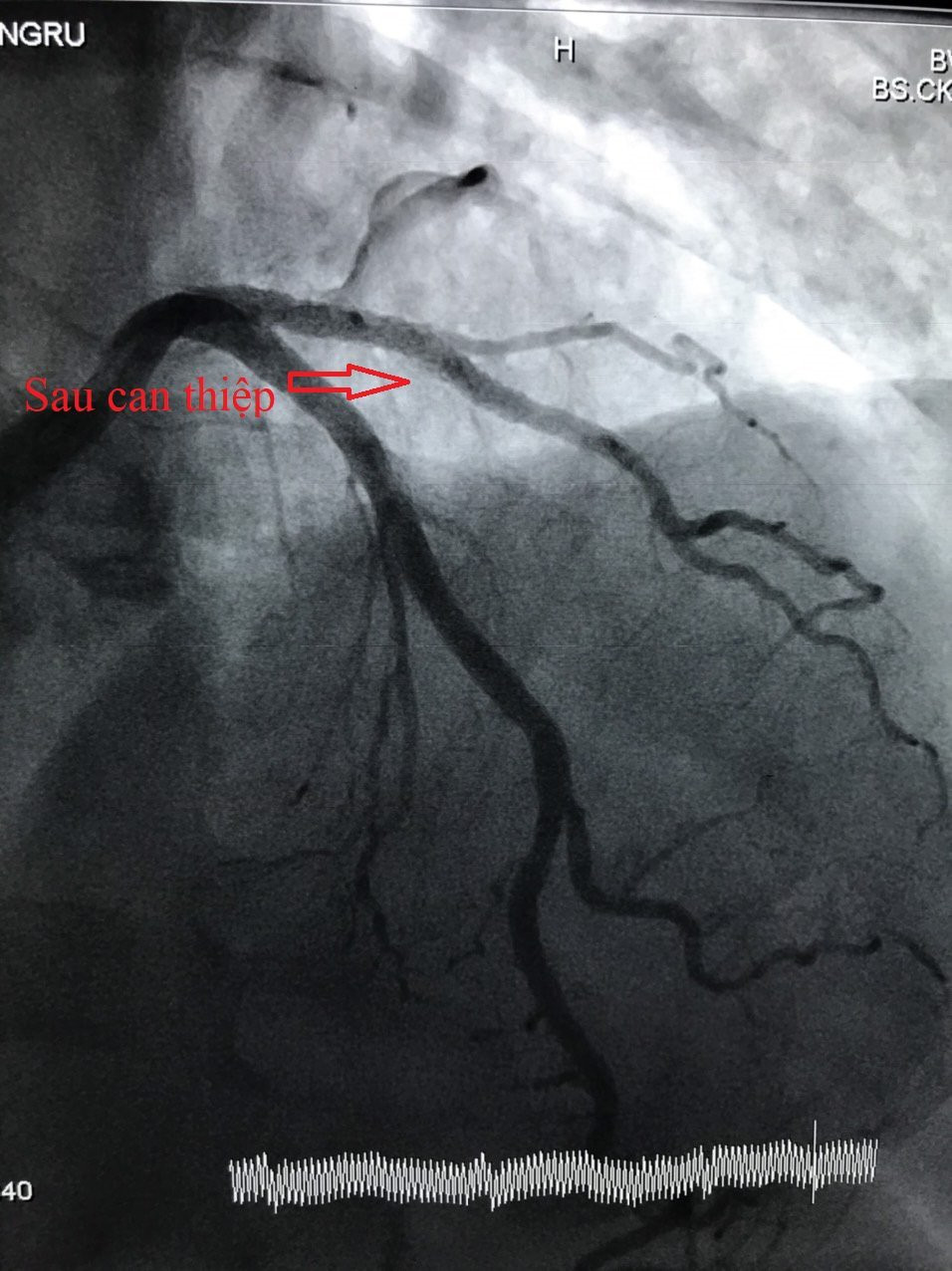 Qua khám và xét nghiệm xác định bệnh nhân W.Z., bị nhồi máu cơ tim cấp và có chỉ định can thiệp mạch vành cấp cứu. Kết quả chụp mạch vành ghi nhận động mạch liên thất trước (LAD) bị thâm nhiễm, hẹp 80% - 90% nhánh chéo 1. Ê-kíp các bác sĩ khoa Tim mạch can thiệp đã tiến hành can thiệp mạch vành cho bệnh nhân bằng cách nong bóng và đặt stent phủ thuốc với thời gian 30 phút do ThS.BS Trần Văn Triệu - Phó khoa Phụ trách khoa Tim mạch can thiệp và BS.CKI Nguyễn Văn Nhiệm thực hiện. Sau can thiệp, bệnh nhân tỉnh, mạch, huyết áp ổn định, giảm đau ngực nhiều và tiếp tục điều trị tại Khoa Tim mạch can thiệp.