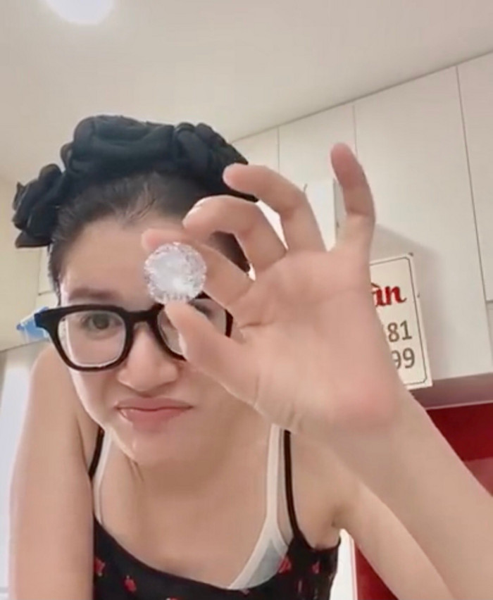 Ngay lập tức, Trang Khàn liền khoe viên kim cương "chà bá" và thẳng thắn cho biết: "Đó, đây không cần phải đánh đèn nhé, kim cương này không cần đánh đèn vẫn sáng lấp lánh. Kim cương nó sáng đây này nên đừng bao giờ đánh giá tôi, tôi không cùng đẳng cấp, tôi chỉ có bán mắm tôm thôi!".