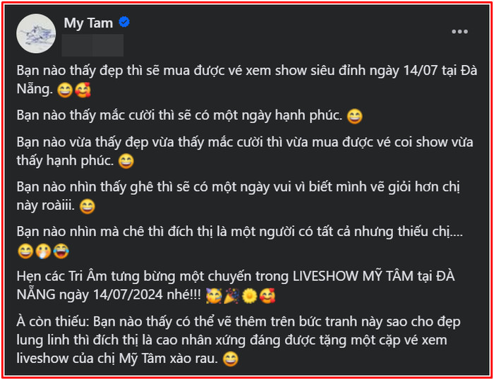 Thế nhưng, với liveshow sắp tới tại quê hương của mình, Mỹ Tâm đã làm một điều khá đặc biệt, chưa từng có tiền lệ trước đó, chính là tự tay vẽ poster để thông báo đến khán giả. Mặc dù những nét vẽ của nữ ca sĩ còn khá "non tay", nhưng Mỹ Tâm vẫn cố gắng hoàn thành tấm poster với đầy đủ những nội dung cần thiết liên quan đến liveshow sắp tới để khán giả có thể nắm bắt.