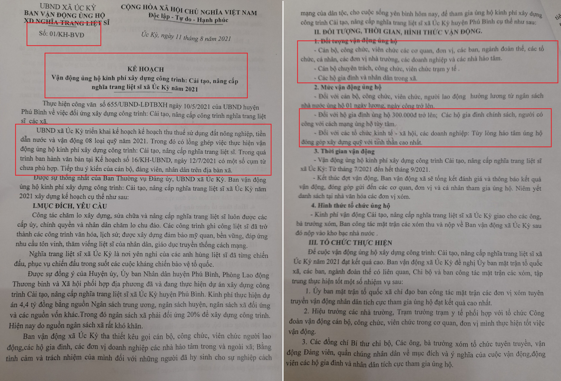 Thực hiện ý kiến của Chủ tịch UBND huyện Phú Bình Dương Văn Hưng về việc xã Úc Kỳ phải đối ứng nguồn vốn bằng 20% giá trị công trình (khoảng 885 triệu đồng). Ngày 12/7/2021, Phó Chủ tịch UBND xã Úc Kỳ ký, ban hành văn bản kế hoạch (số 16) giao thu tiền đối ứng nghĩa trang liệt sỹ. Việc thu tiền đối ứng chia làm 2 đợt, trong đó đợt 1 thu gần 500 triệu đồng (300 nghìn/hộ).